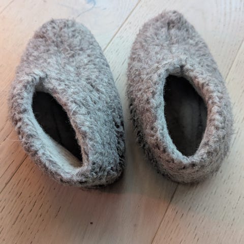 Store, varme og myke tøfler med filtsåler. Ikke brukt, kun prøvd. Veldige behagelige å ha på. Selges billig fordi de dessverre er litt for store for meg. (Størrelse Large)