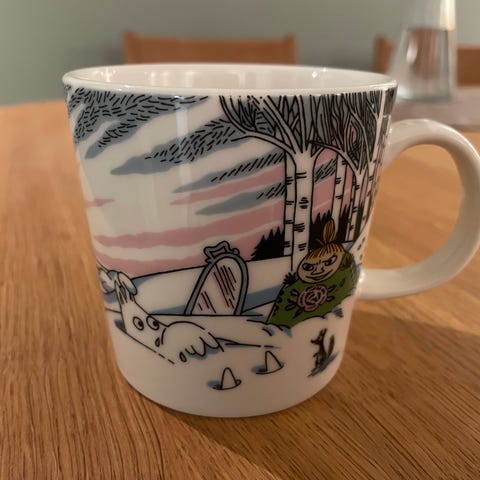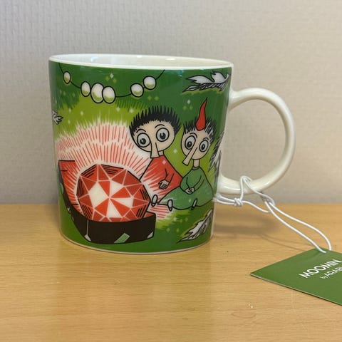 Arabia Mummikopp keramisk kopp med fargerikt Mummimotiv. Koppen har en rund form med hank og er dekorert med detaljerte bilder av Mummifigurer og natur. Passer til bruk som drikkekopp for varme og kalde drikker.