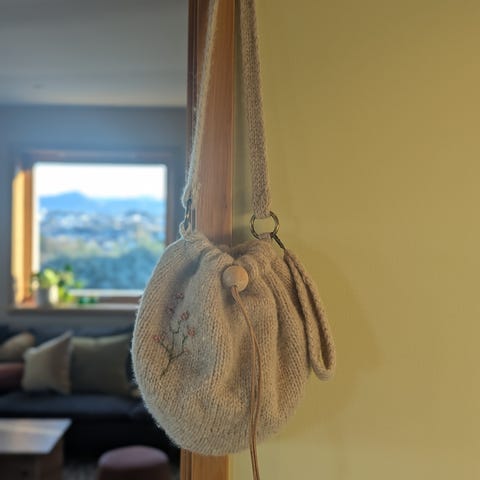 Ubrukt hjemmestrikket bag med lang hank for å krysse overkroppen. Strikket i DMC Natura Cotton XL 100% bomull. Veska er foret med et søtt gult stoff med bier og har to åpne lommer inni. Forstoffet er også 100% bomull.