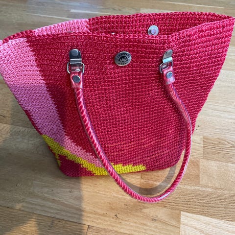 Veldig pen og stor strandveske, laget av papir, foret inne, 2 lommer, merke Barts, 3 farger, 2 rosa og natur. 1 stor reim og 2 mindre. Passer på skulder. Magmetlås.