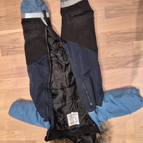 Hempen i nakken på buksen har mistet festet på ene siden. Refleksen har falmet og baken er slitt, men funker helt fint som en ekstra-dress til bhg eller hjemme