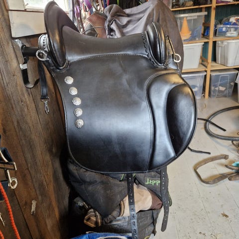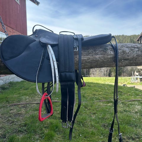Selger en sort Piab 17,5 tomme sal, inkludert halereim, hodelag med tøyler, sabrack (teppe), grime og leietau.