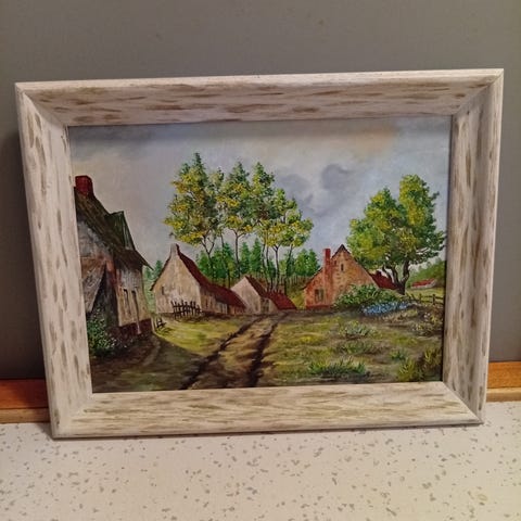 Ukjent merke Hestemotiv relieff bilde av metall med to hester i et naturlandskap. Bildet er laget i reliefstil med farger og er innrammet i en treramme. Bildet har et rustikt og håndlaget utseende med naturfarger og detaljer i treverket rundt.