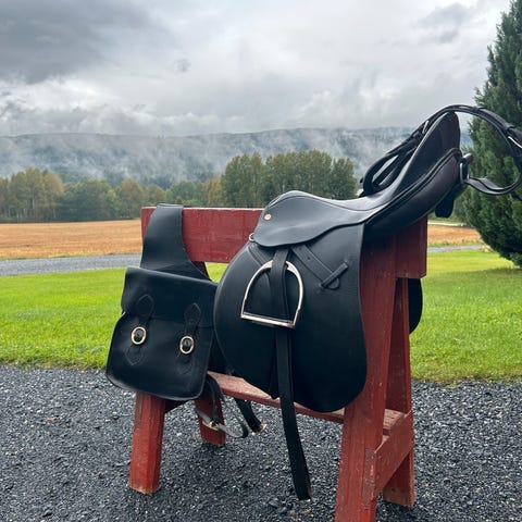 Selger en brun Cob 16’’ sal fra Argentina. Den er komplett med halereim, hodelag med tøyler, ny woilock (teppe under sal) og med grime med leietau.