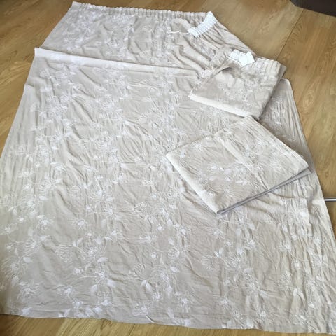 Duk, stor firkantet duk i tykk bomull for spisebord. Duken er hjemmesydd og helt ny. Er kvadratisk 122 cm. Kr 150,-. Blomstervase og 2 lysestaker i ett sett fra Kremmerhuset. Vase høyde 15 cm og lysestaker høyde 11 cm. Hvite med gull trekanter. Kr 270,- for alle 3 delene.