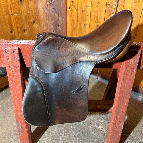 Selger en brun Stubben 17,5’’ sal. Den er komplett med nye stigbøylereimer uten stigbøyler, hodelag med tøyler, woilock (teppe under sal) og grime med leietau.