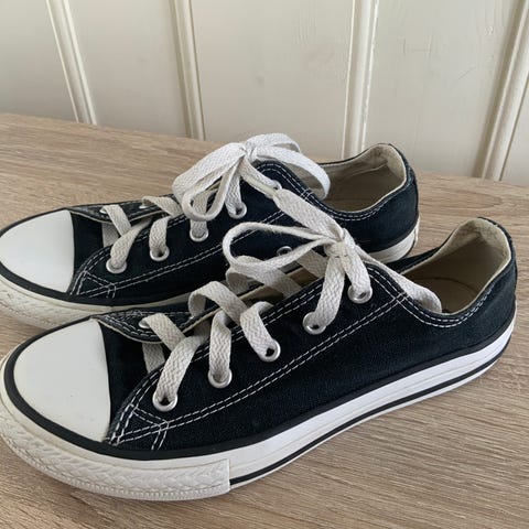 Converse All Star barnesko i størrelse 29. Skoene er laget i blått stoff. De har hvite lisser og gummisåler med klassisk design. Skoene er egnet for barn og har en lav profil.