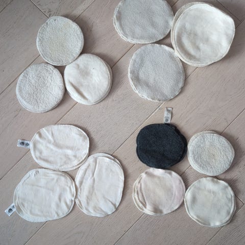 5 av de er fra Lille Lam og er enkle og er ren ull. Det sistnevnte (med litt annerledes form) har et silkestoff inn mot brystet og ull ytterst.