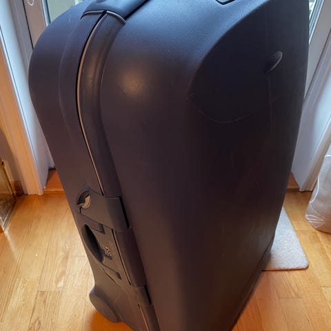 Flott koffert, fin farge - denne ser du enkelt på rullebåndet! Kun to hjul, men triller lett.