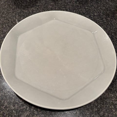 1 sett med grønn farge som er pent brukt og minimalt med merker utenom det ene avskallingen man kan se på det ene bildet. Bestående av 6stk store tallerkener, 6stk små og 6stk dype.