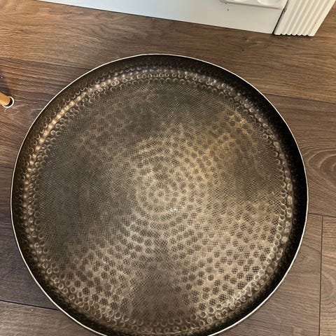 Nydelig dekorasjonsfat/stettfat/serveringsfat i metall fra Danmark til salgs. Kan brukes til dekorasjon med kubbelys, granbar m.m, eller til servering.