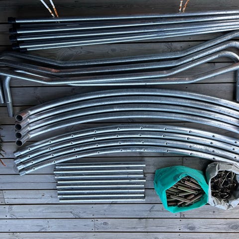 Oppbevart innendørs gjennom vinter, med unntak av stålrammen som har stått montert ute.