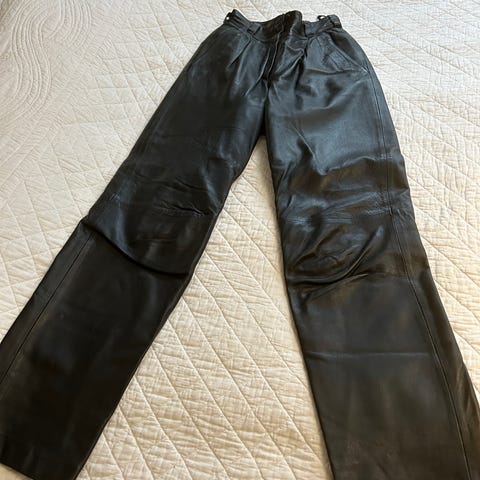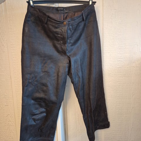 Skinnbukse med flatt liv, og litt kort lengde over støvel. Elastikk nederst i beina. Mørk grå