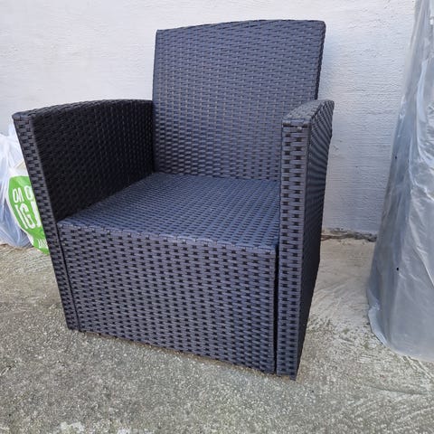 Hagemøbel sett bestående av en 2-seters sofa, to stoler og et bord med glassplate. Møblene er laget i brun rotting og har tilhørende puter. Settet egner seg for utendørs bruk og er meget værbestandig.