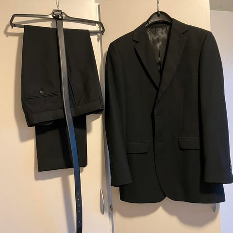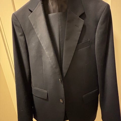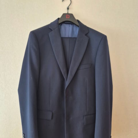 Dressen har smal passform. Det følgjer med ei kvit skjorte også.