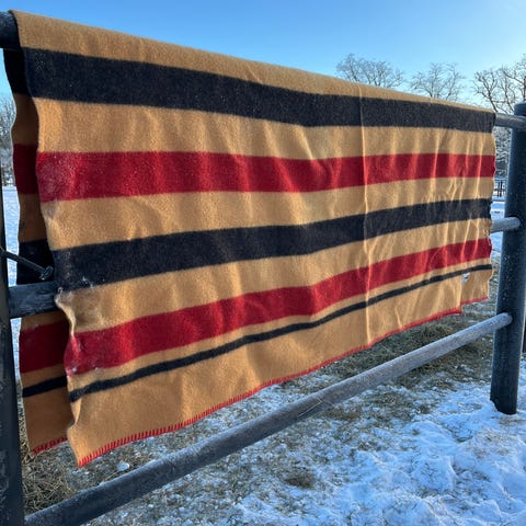 Meget pent og veldig lite brukt Shires Golden Stripe ullteppe, str.160x180.