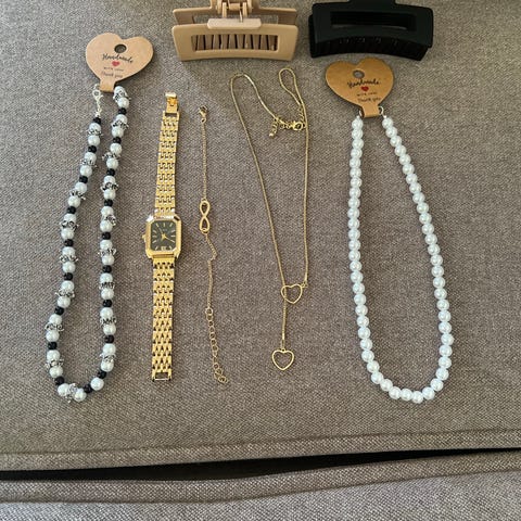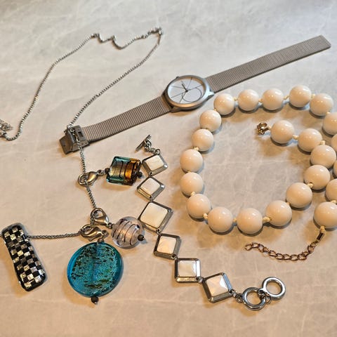 En god slump med bijouterie selges, helst samlet i medfølgende smykkeskrin. Kan også selges hver for seg til avtalt pris. Alt er helt og pent.