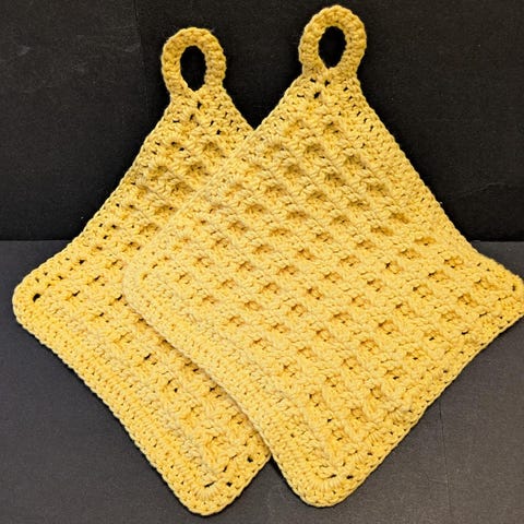 Hekket grytelapper og strikket klut i Mandarin Petit.