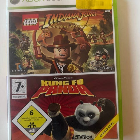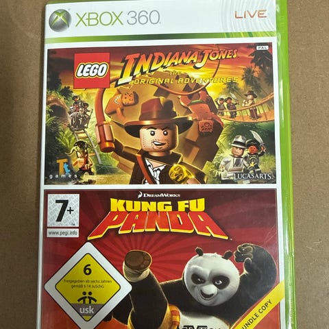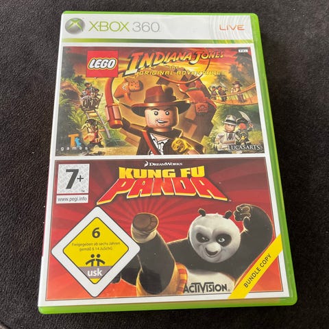 LEGO Indiana Jones og Kung Fu Panda Xbox 360 spill. Inneholder to spill på én disk: LEGO Indiana Jones og Kung Fu Panda. Passer for aldersgruppen 7 år og oppover. Spillene kombinerer eventyr og action med kjente karakterer fra LEGO Indiana Jones og Kung Fu Panda universene.