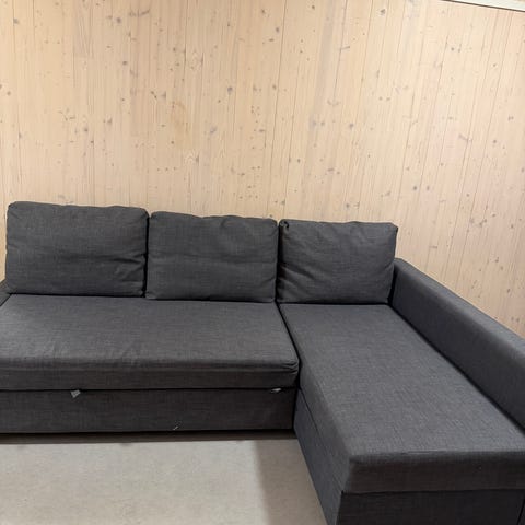 Pent brukt IKEA FRIHETEN hjørnesovesofa i fargen Skiftebo mørk grå selges. Sofaen er komfortabel og praktisk, og kan enkelt slås ut til sovesofa. Det er romslig oppbevaring under sjeselongen. perfekt til sengetøy, puter eller tepper.