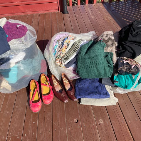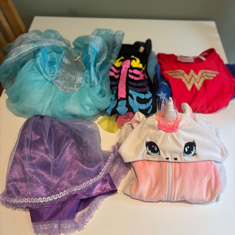 fargerike sko, 1 par gullsko, (begge str. 38/39) 3 t-skjorter med trykk, 3 par solbriller, bride to be bånd x 2, badedrakt (kun prøvd på med undertøy under) , ring, knall rosa pulsvarmere i netting, hårstrikk, øredobber, hatt og kopper. Produktene varierer i materiale og farger, egner seg spesielt godt til utdrikningslag.