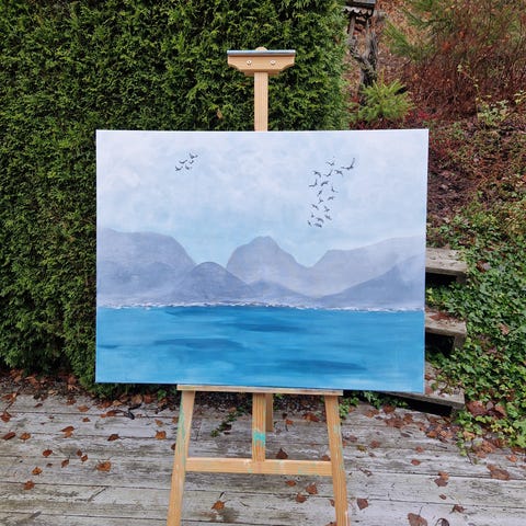 Lerretet er spent opp på en blindramme med 4 cm dybde.