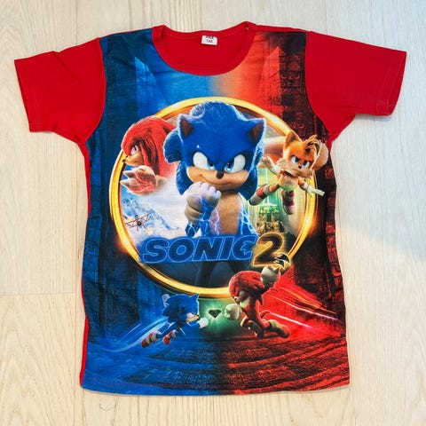 Selger en kul hvit genser med Sonic the Hedgehog-motiv på brystet og trykk på ermene.
