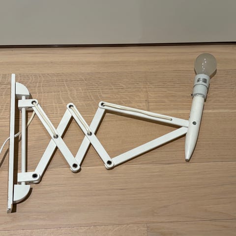 Diameter 36 xm, max uttrekk ca 115 lengde. Finere når den trekkes mindre ut. Svensk lite støpsel som må byttes ut. Liten defekt på ringen ovenfor der pæra sitter. Har ingen betydning for funksjonen.