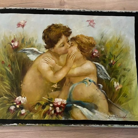 Ser bra ut men det er store rynker langs begge kantene samt merker hjørnet. Rammen er bra.