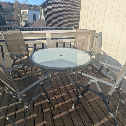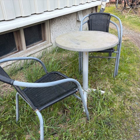 Utemøbelsett bestående av et bord og to stoler, laget av metall. I all weather materiale. Settet er egnet for utendørs bruk og har en enkel, funksjonell design. Stolene er litt misfsrget, men kan være mulig å vaske av.