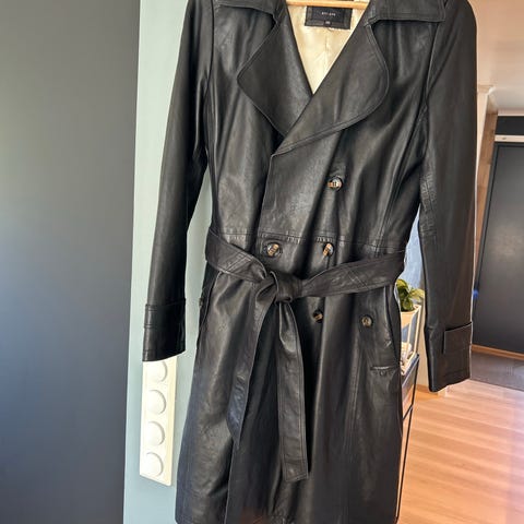 Kul og klassisk! Trenchcoat i 100% skinn fra franske A.P.C - et sjeldent plagg som passer perfekt til sesongens look. Kommer med patina og har noen bruksmerker. Se også bilde av pennestrek på baksiden ved håndledd - lite synlig ved bruk. Påsydde lapper på albuene på grunn av slitasje. Kan renses. Opplever den som litt liten i størrelse, men typisk APC i passformen.