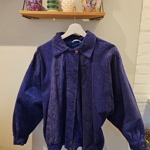 Selger en vintage skinnjakke i semsket skinn. Jakken er i en rød/ oransje farge med knytedetaljer i skinn foran på jakken og på ermene. Størrelse M. Jakken er halvforet. Skinnet har noe slitasje på ermene hvor fargen er litt lysere.