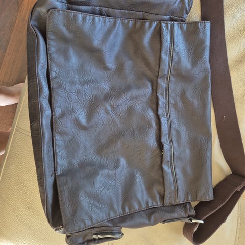 Selger en pent brukt sekk i kunstlær og slitesterkt stoff. Ca 38 cm i høyde og 30 cm i bredde.