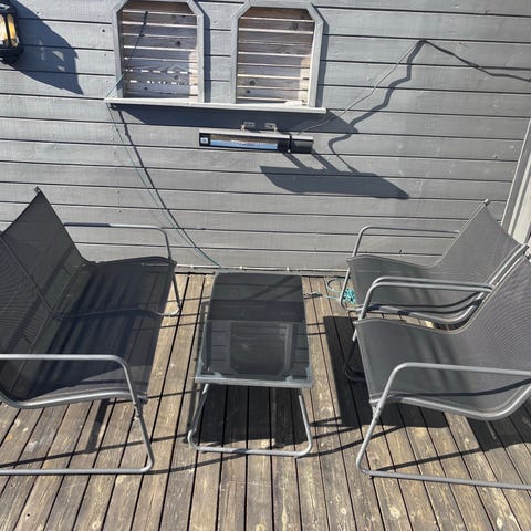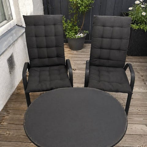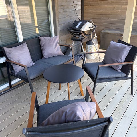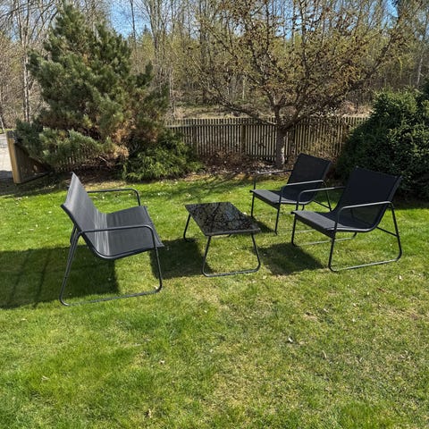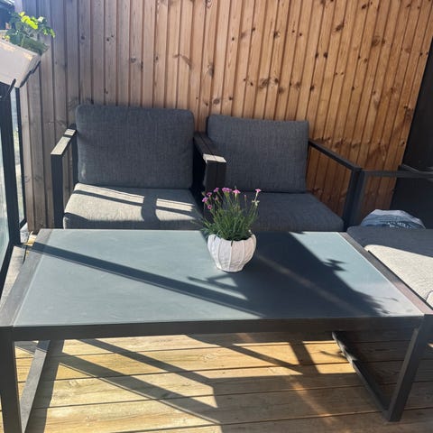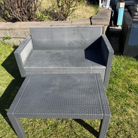 Loungemøbler lite brukt. Toseter sofa, bord og to stoler.