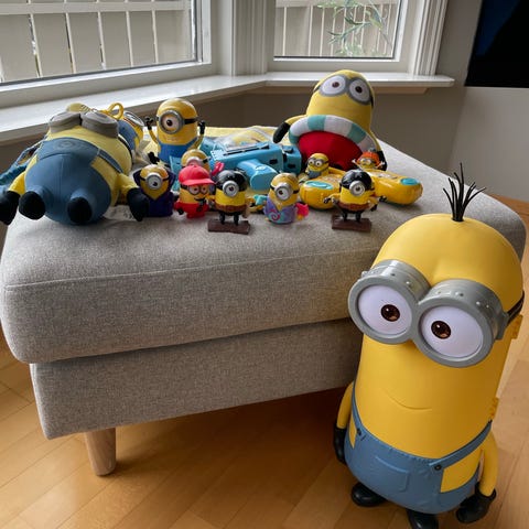 Minions samling bestående av diverse Minions-leker og samleobjekter. Inkluderer fargerike figurer, en stor Minions-dukke, en strikket lue med Minions-øyne, fargeleggingssett med Minions-tema, og flere små Minions-figurer i forskjellige størrelser og design. Materialene varierer mellom tekstil, plast og papir. Passer for Minions-fans og samlere.
