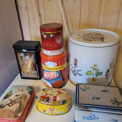 Gamle kakebokser/oppbevaringsbokser selges. Retro. Fine til å bruke eller som pynt.