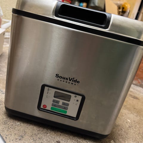 SousVide Supreme i rustfritt stål med digital kontrollpanel. Inkluderer vannbad med stativer for posisjonering av matposer. Designet for presis temperaturkontroll ved tilberedning av mat ved lav temperatur over lengre tid.