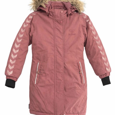 Jakken har avtagbar hette med pelskant, glidelås lommer og justerbare mansjetter.