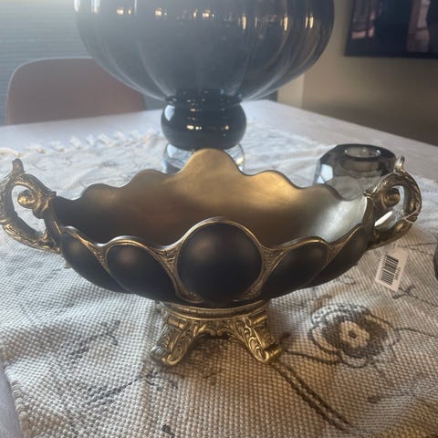 Stor og flott skål på tre bein med flotte gulldetaljer. Den har en mørkeblå/sortblå farge.