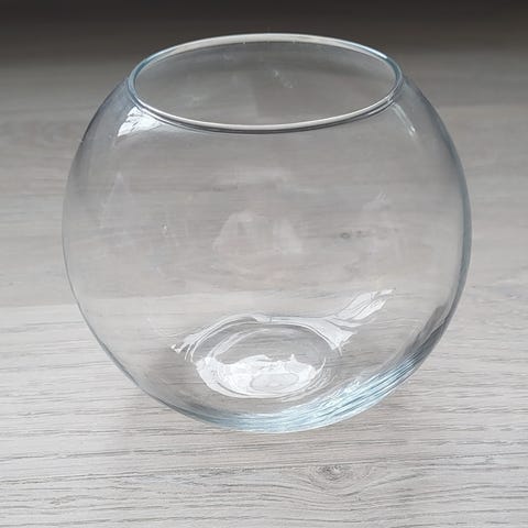 Lav vase/ glassbolle/ blomsterfat. Veldig dekorativ. F eks fin med vann og blomsterhoder flytende oppi. Er ikke i veien for samtalen tvers over bordet da den er så lav.