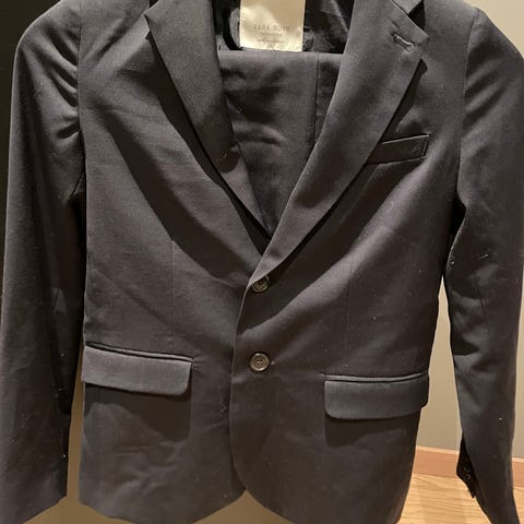 H&M barneblazer sett med bukser og skinn pensko. Blazeren er i størrelse 146 for gutt. Blazeren er svart og har detaljer i blankt materiale på krage og lommer. Egnet som formelt ytterplagg eller til spesielle anledninger.