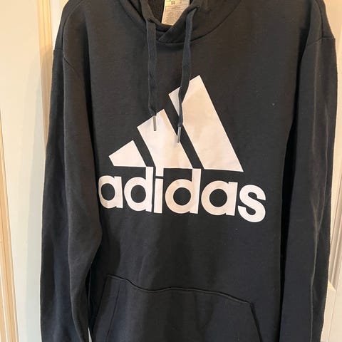 Ubetydelig brukt Adidas hettegenser med kengurulomme. Svart med logo i kontrastfarge, str xs.