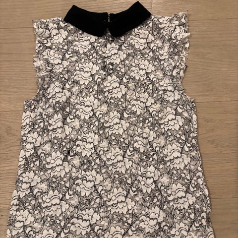 Selger en topp i svart og hvit farge. Størrelse M. Kjøpt fra Zara, brukt kun 1 gang. Toppen har et mønster med hvite detaljer og er uten ermer. Passer til ulike anledninger og kan kombineres med flere typer klær. Toppen er ca. 58 cm lang. Selges da den ikke passer lenger.