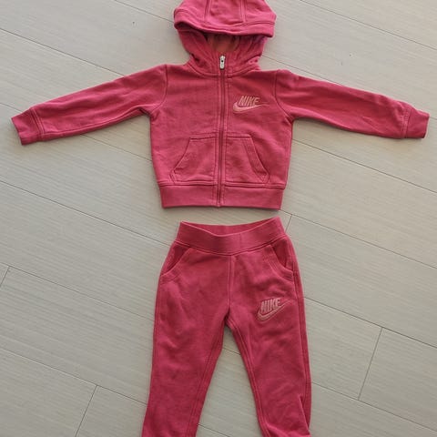 Nike barneklær joggedress i størrelse 86 for unisex. Dressene kommer i rosa og turkis farge, laget for komfort og bevegelsesfrihet. Passer for små barn og har Nike-logo og grafiske detaljer på buksen. Helt nye. Kun vasket.150 pr stk 250 for begge