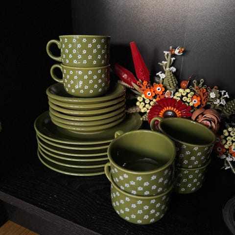 Cuisine stengods, 1 år gammelt service, 24 deler, kun stått "til pynt" i skapet på hybelen. Må hentes, sendes ikke.