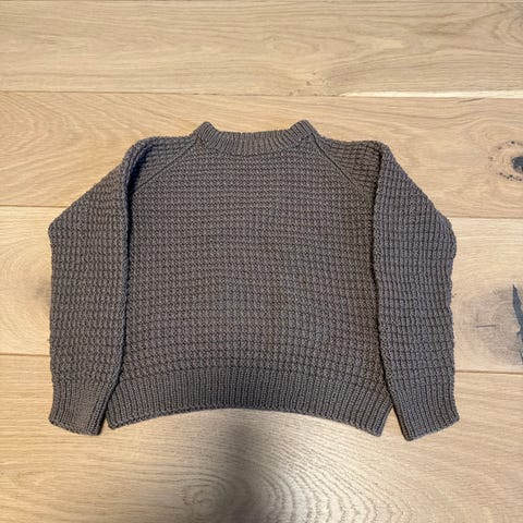 Ullgenser hjemmestrikket i lilla farge, størrelse 86, til jente. Genseren har tradisjonelt mønster og er laget for barn i denne størrelsen.