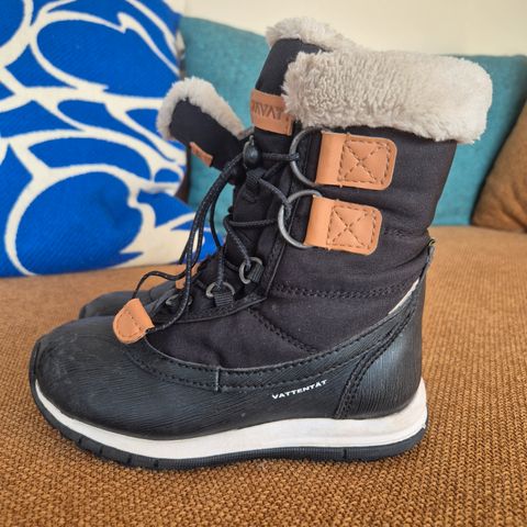 Kavat vinterstøvletter str 28. Foret og med ullsåle. Brukt av ett barn en vinter. Noe slitt foran på tuppene, vil tro det kan repareres med impregnerende skokrem. Ny pris 950 kr