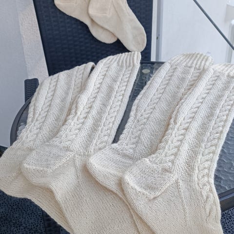 Strømpene i ull er i størrelse 42/43, er laget til Fana/Hardanger-bunad og er ubrukte. Den ene strømpen har en lys flekk (se bilde).
