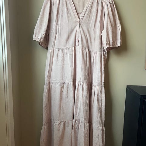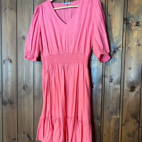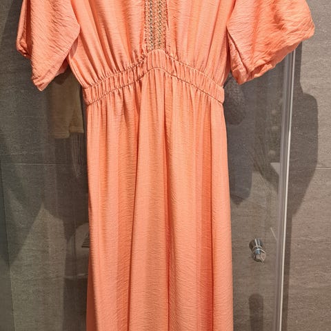 Kjole fra Suncoo Paris i en nydelig ferskenfarge. Selges fordi den dessverre er litt for stor for meg. Den er i størrelse T1, tilsvarende S. Den er i god stand, men stoffet er nuppete. Det er så jevnt fordelt at det er vanskelig å se om stoffet skal være sånn - jeg har kjøpt den brukt, og forrige selger skrev at kjolen var lite brukt. Jeg synes ikke det gjør noe, i hvert fall. 85 prosent bomull, 10 prosent polyester, 5 prosent viskose. Kjolen har strikk i livet.