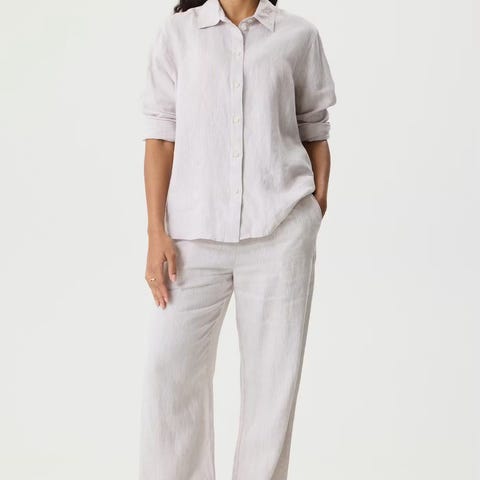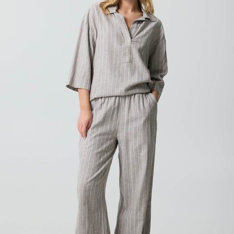 Knapt brukt nydelig linsett bestående av bukse og skjorte. Vid bukse i linblanding. Buksen er high waist og har strikk i livet. Buksen er super komfortabel med vide ben og lommer i siden.